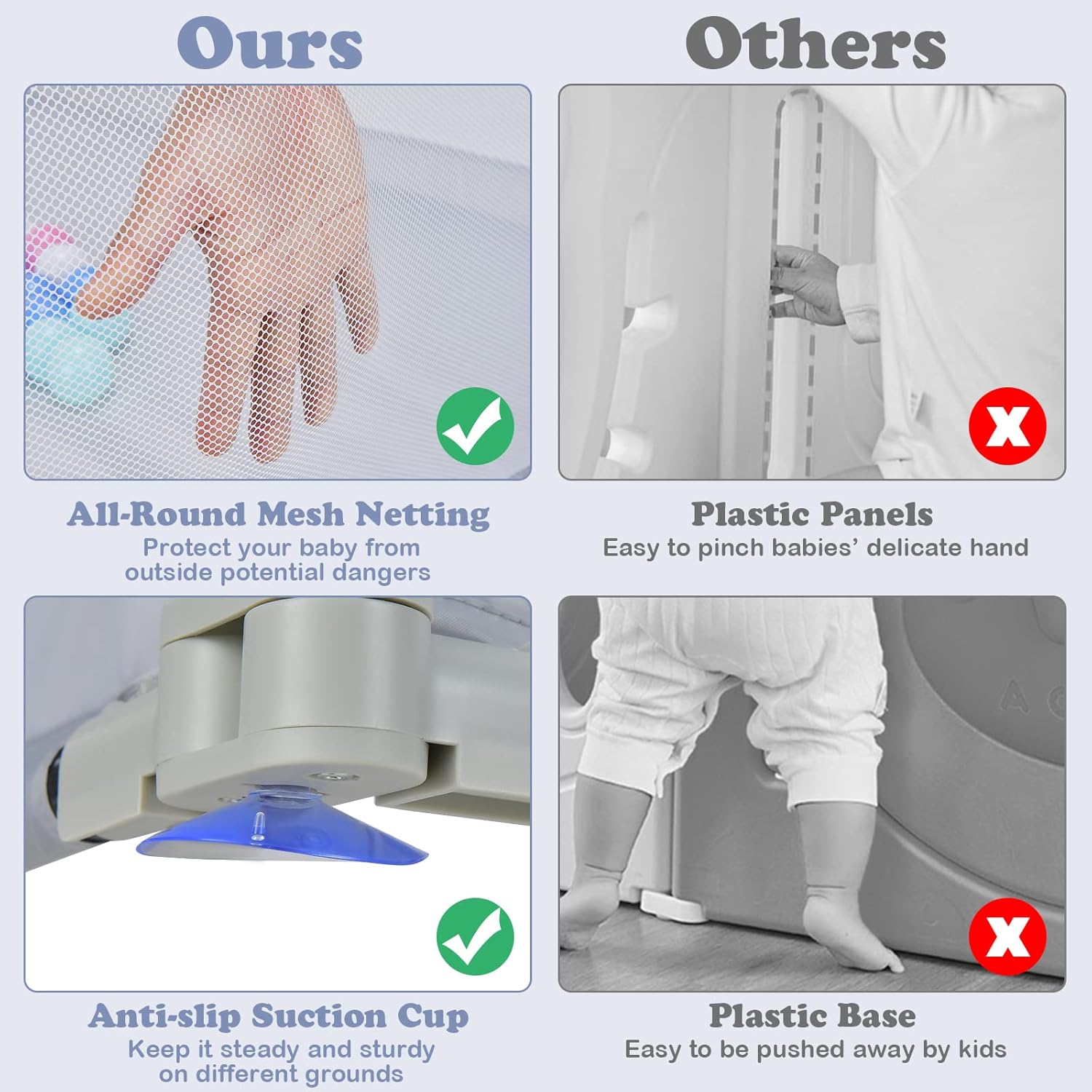 - Great Helper for All Parents: Our baby fence is an excellent helper for parents. Different from others with plastic panels and plastic base, our baby fence is not easy to pinch babies' delicate hand. With this playpen, kids can safely explore the world.
