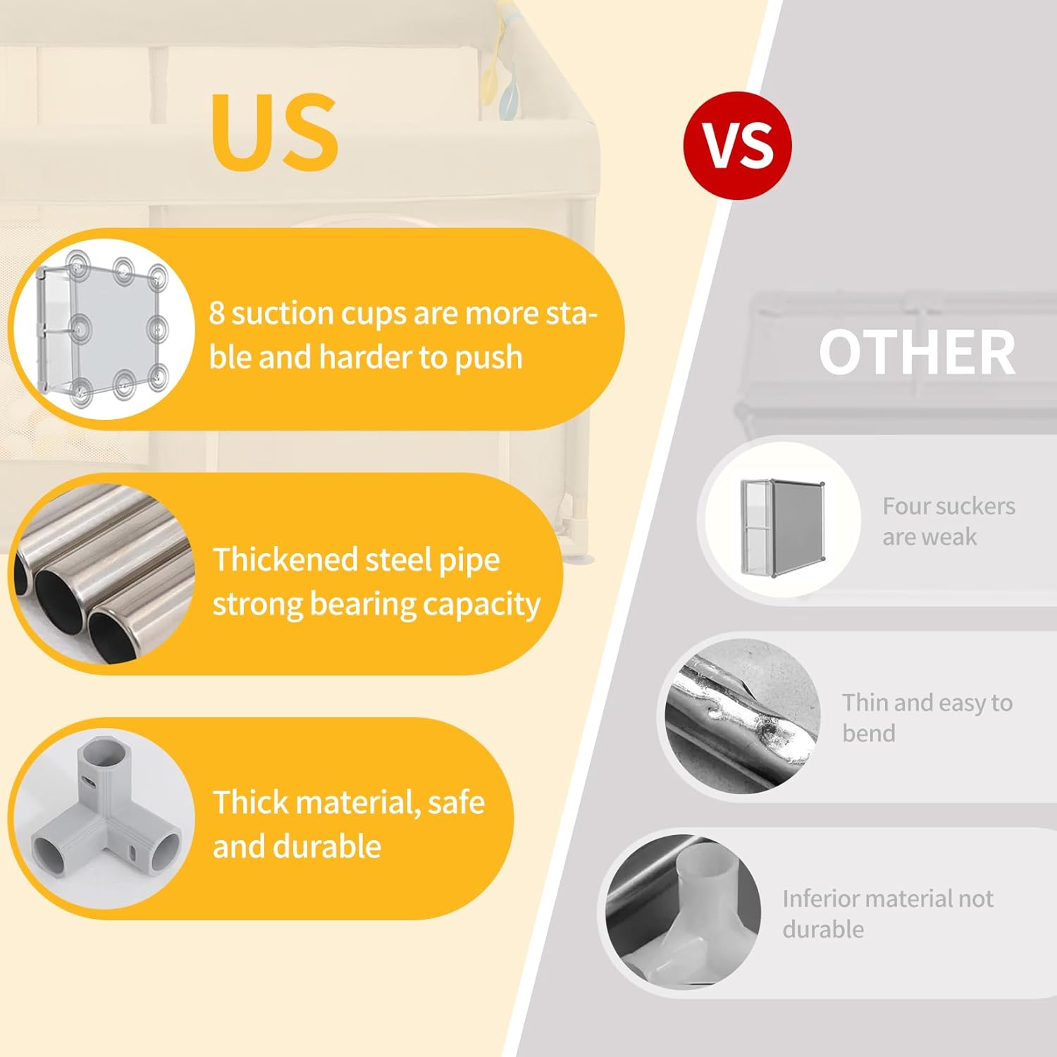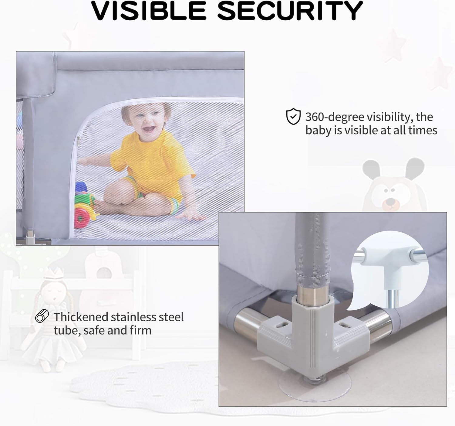 - Safety Eco-Friendly Material & Non -Slip: Giant fences is made of Resistant-duty encryption 300D oxford cloth material & strong fabrics net sidings, which is tougher & more durable than (other brands only 210D Oxford cloth), BPA free, easy clean, soft and odorless, simply hand wash and wipe down with a damp cloth and soap to keep it fresh and sanitary. with 8 TPR suction cup base strengthen stability. Even if 150 pounds of adult lean on, which will not turn over.