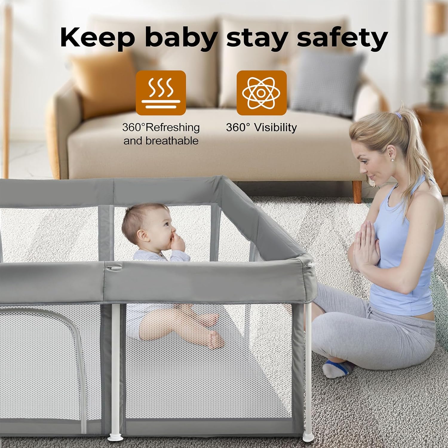 - 360° ALL-VISION DESIGN - This playpen features a 360° all-round design, allowing parents to keep an eye on their baby from all angles through the dense mesh. Whether you are in the kitchen or the living room, you can easily monitor your baby's activities.