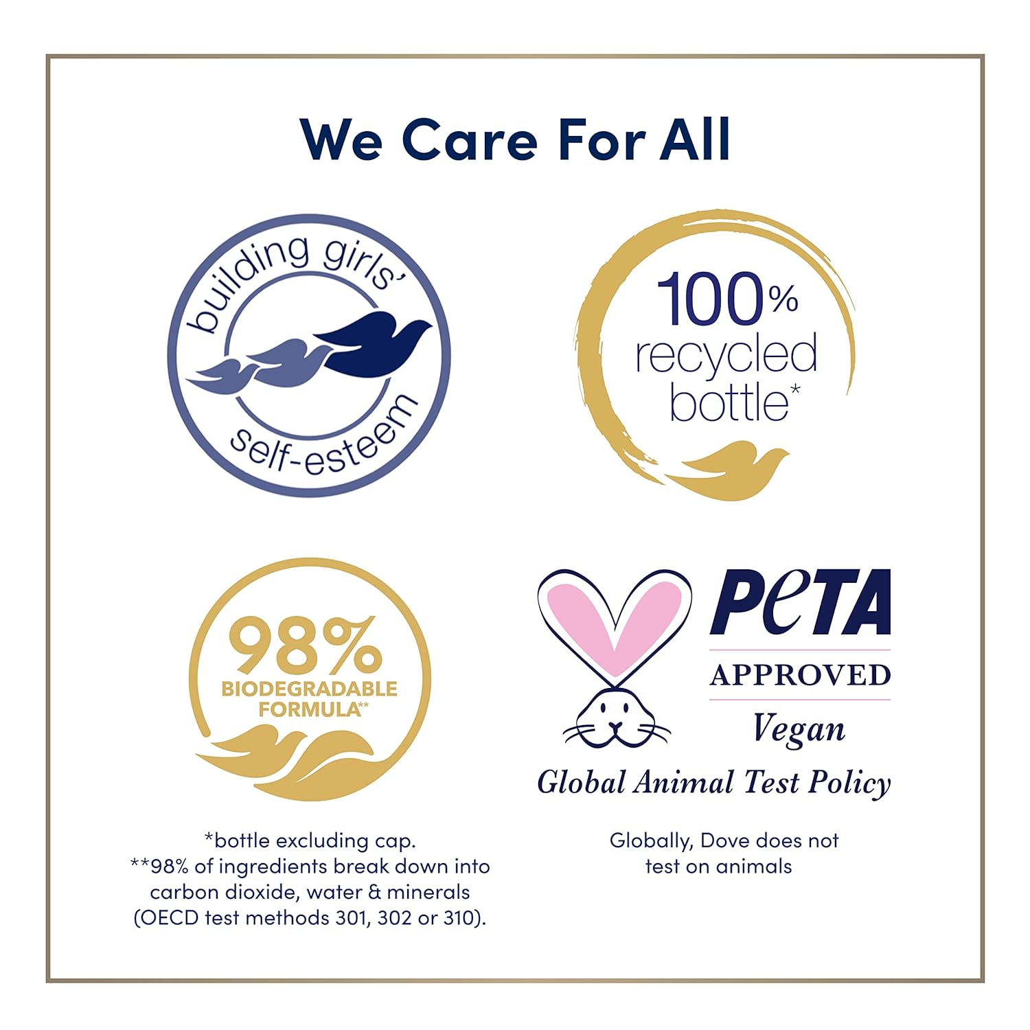 - THOUGHTFULLY MADE: This sulfate-free body wash is vegan and Dove is PETA approved, meaning we do not test on animals, anywhere in the world. Our body wash is packaged in 100% recycled plastic bottles, so you can feel good about switching to Dove