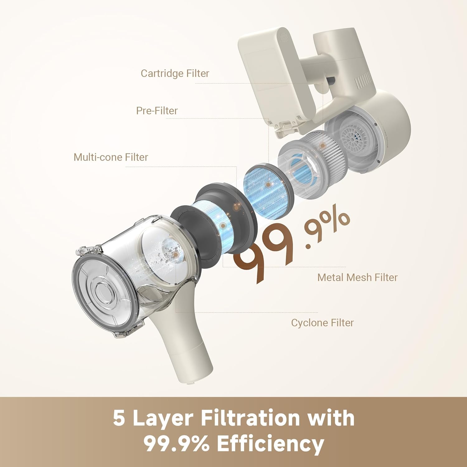 - 【99.9% Efficiency 5-Layer Filtration】Advanced 5-layer filtration system captures and removes fine dust and particles from the air with maximum filtration efficiency of 99.9%*. The advanced multi-corn dust collection filter prevents suction loss, ensuring that dust will enter into the dust cup and can be disposed with a single button