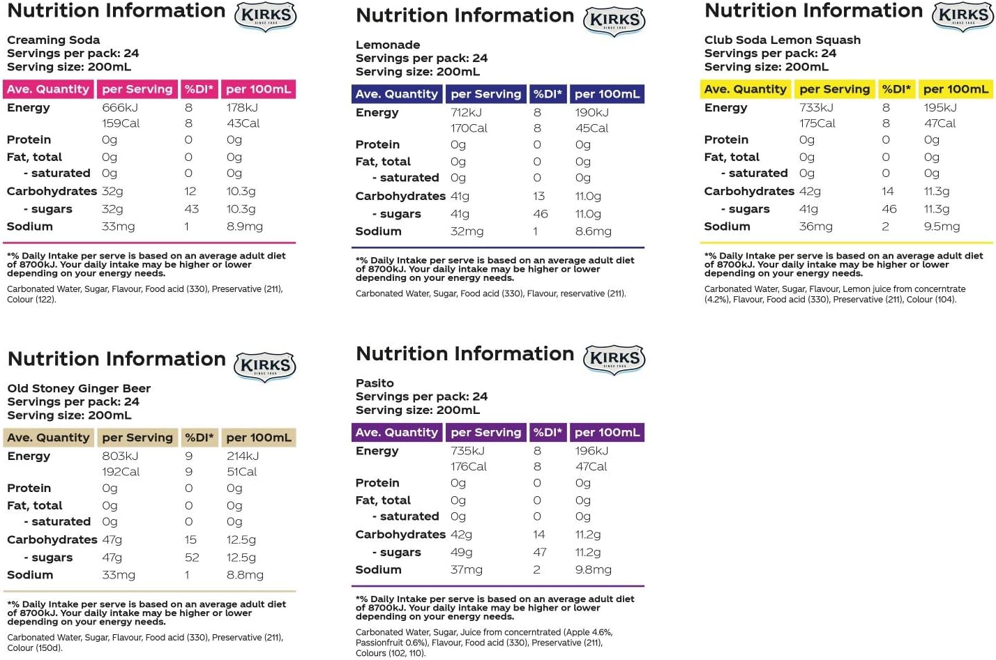 - The Kirks Variety Pack of soft drinks includes 30 x 375mL cans consisting of 6x Pasito, 6x Lemon Squash, 6x Lemonade, 6x Ginger Beer, 6x Creaming Soda flavours