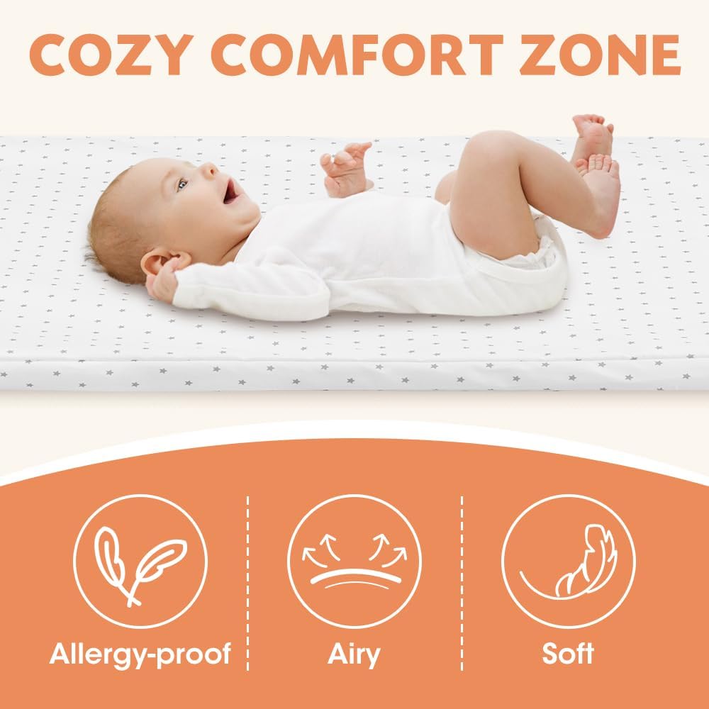 - Cozy Comfort: Designed for restful sleep, this baby bassinet features a hypoallergenic mattress that combines soft foam and firm PVC hollow board support for exceptional comfort and safety. Breathable mesh panels improve airflow and visibility, while the included mosquito net shields against insects, giving your baby peaceful, uninterrupted sleep day and night.