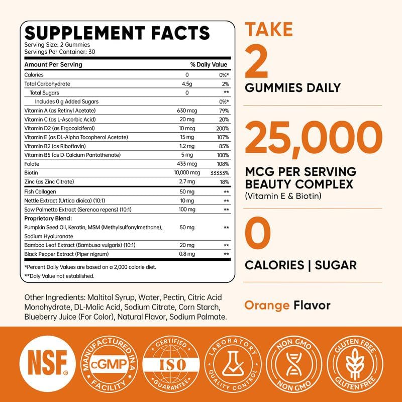 - Biotin 10,000 mcg & Collagen Gummies: Our premium biotin gummies deliver 10,000 mcg of biotin to support hair growth, combined with collagen, keratin, and saw palmetto to help maintain healthy hair, skin, and nails. This hair skin and nails vitamins designed to complement your routine