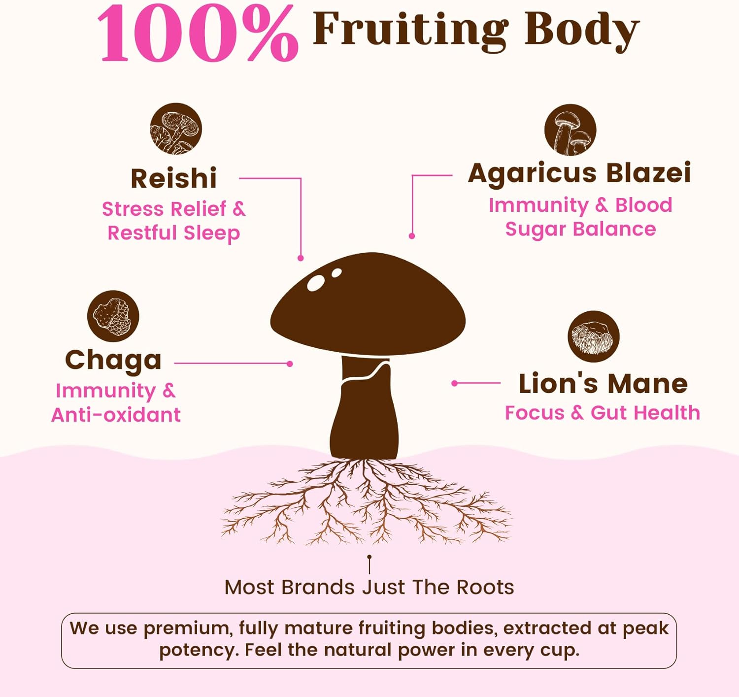 - MULTI-FUNCTIONAL WELLNESS BLEND: A synergy of Lion’s Mane for focus, Reishi for calm and immunity, Chaga for antioxidant defense, and Agaricus Blazei for immune support. Enhanced with hydrolyzed bovine collagen for skin, joints, and hair, plus Vitamin C, Biotin, Hyaluronic Acid, and Folate to boost collagen, hydration, strength, and cellular renewal